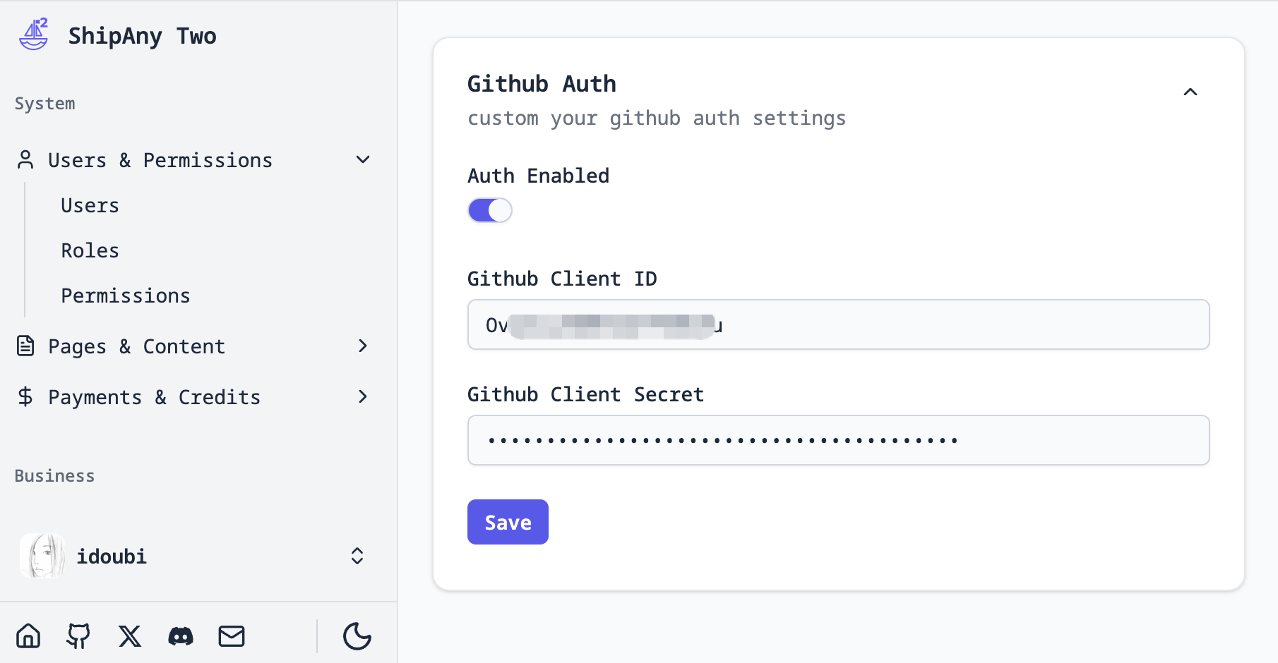 在项目管理后台,进入 Settings -> Auth -> Github Auth 面板,填入上一步复制的 Client ID 和 Client secret。