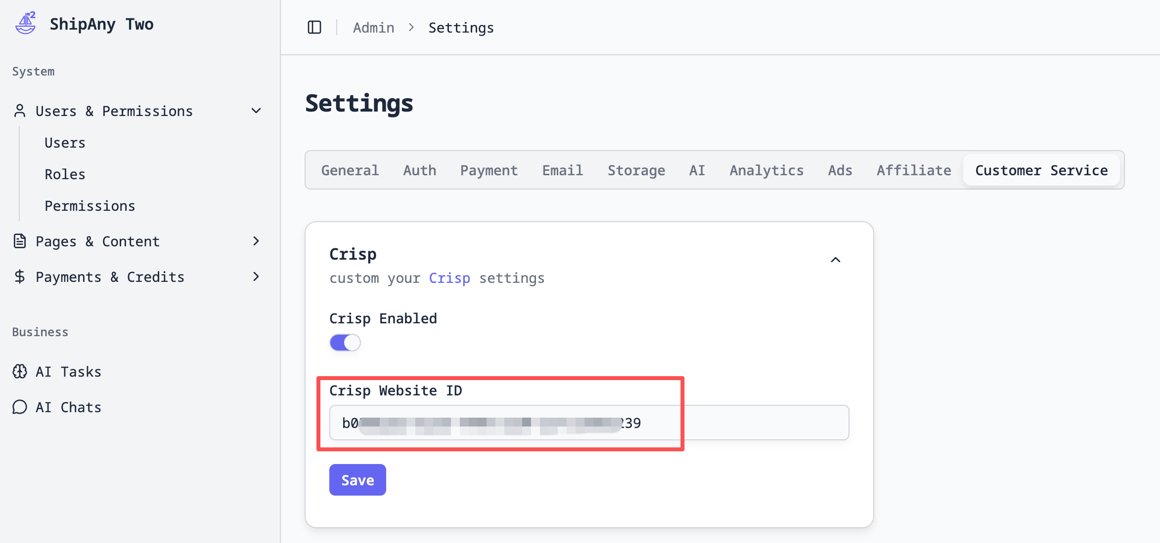 在项目管理后台,进入 Settings -> Customer Service -> Crisp 面板,在 Crisp Website ID 字段填入上一步复制的 Website ID。