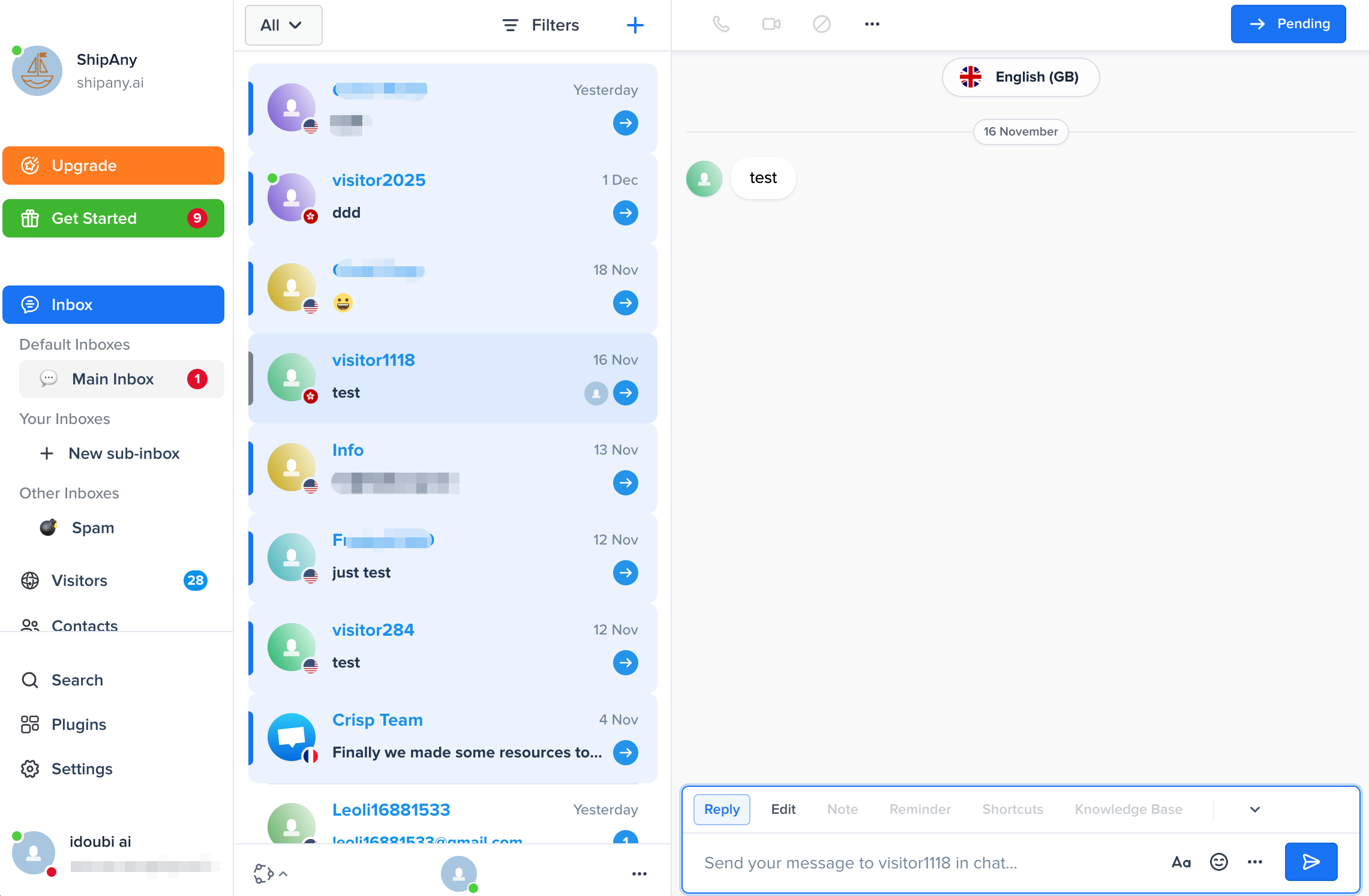 在 Crisp 控制台,进入 Inbox 页面,查看用户留言,回复用户留言。