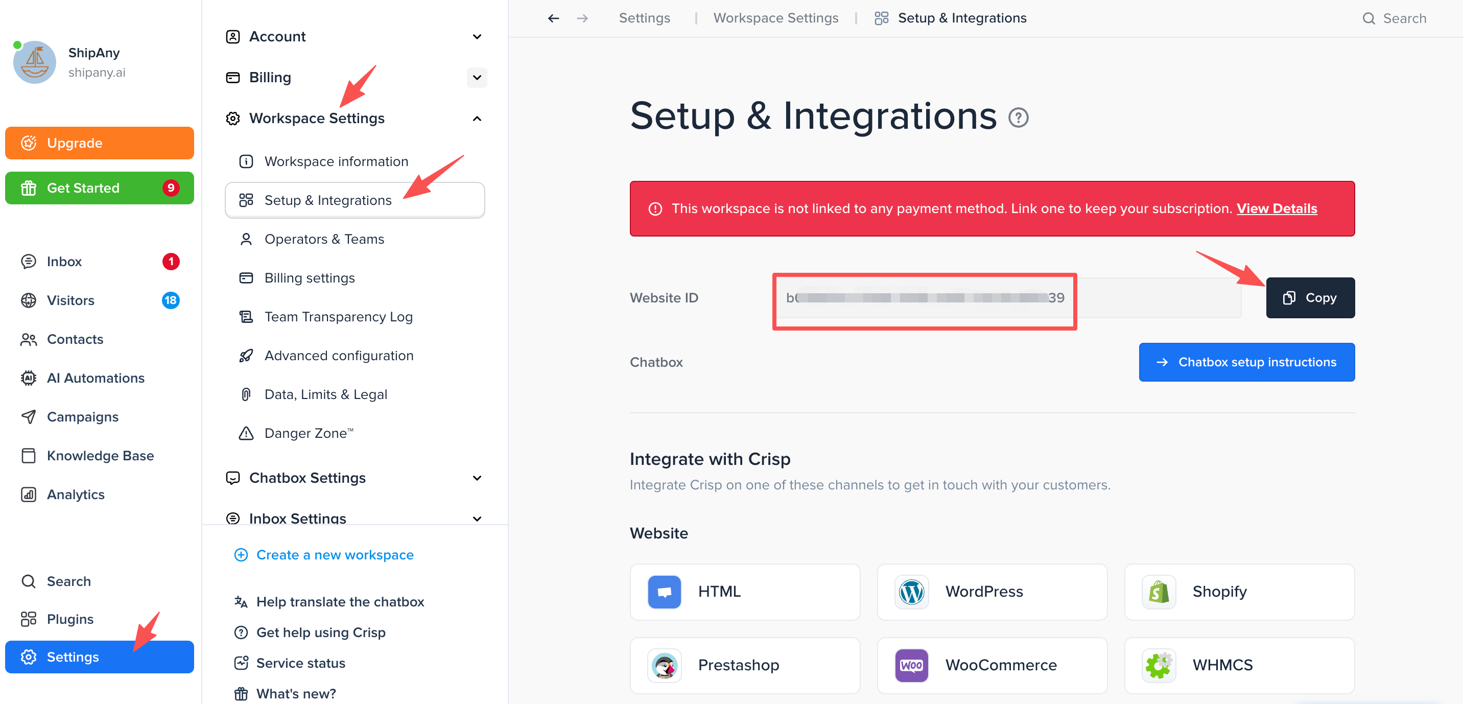 进入 Settings -> Workspace Settings -> Setup & Integrations 页面,复制 Website ID。