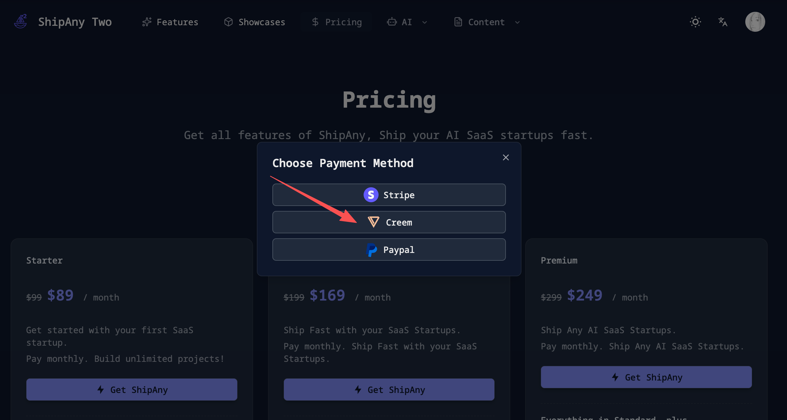 ShipAny 集成了 Creem 作为支付服务供应商,只需简单配置即可接入使用。