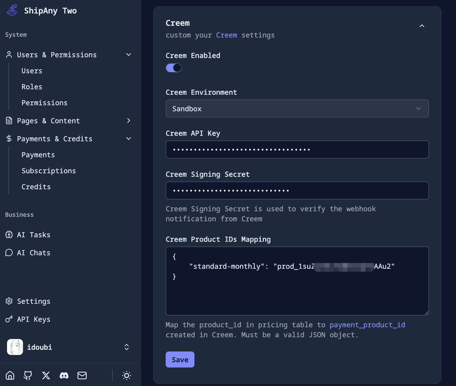 在项目管理后台,进入 Settings -> Payment -> Creem 面板,在 Creem API Key 字段填入第 2 步复制的 API Key。