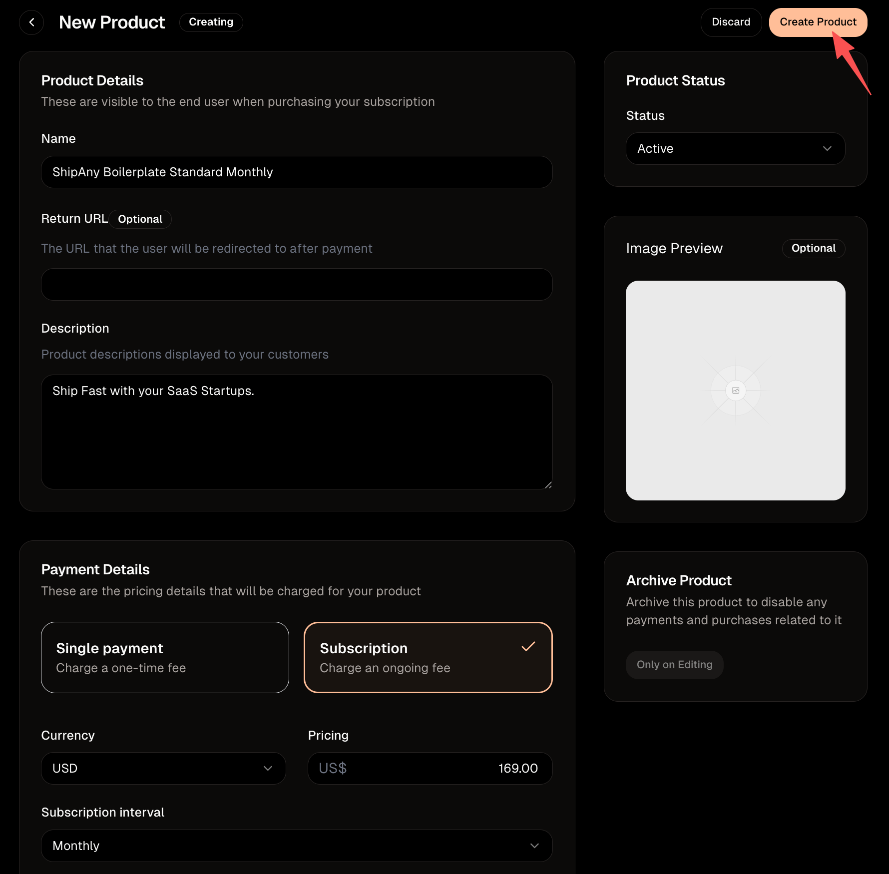 "product_name": "ShipAny Boilerplate Standard Monthly",
